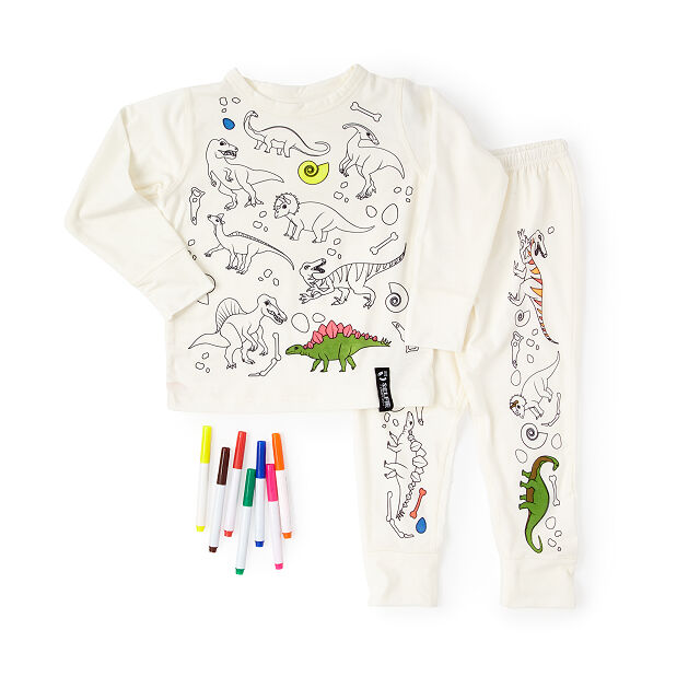 This one is perfect for your Snooze-O-Saurus: Color-In Dino Pajamas! Did dinosaurs wear jammies? Scientists can't say for sure. Your tiny paleontologists can ponder these mysteries and more as they color this illustrated PJ set, hand-printed in the UK. The markers' UV-activated ink means they won't have to wait a whole Jurassic period to wear. These are also seriously comfy and cuddle-ready (who knew these prehistoric beasts could be so soft?).