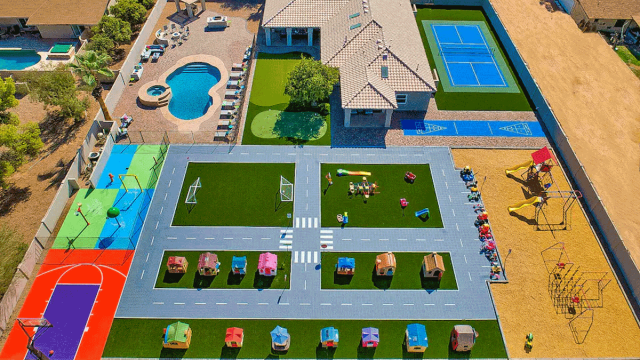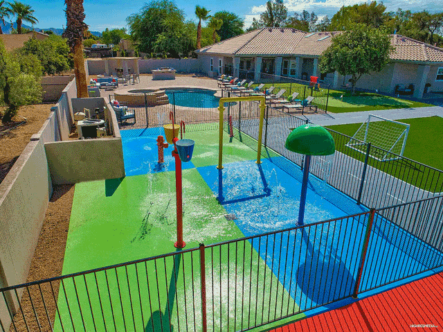 Cool off from the Arizona sun in your own splash pad with everyone’s favorite dumping buckets at this rental that sleeps 13. Known as “The Playhouse Retreat,” everything your family needs is under this roof from pack n’ plays to strollers to car seats. The backyard features a fenced-in swimming pool and an awesome kids’ play area with 14 playhouses and tons of mini bikes to ride on the kid-sized streets.