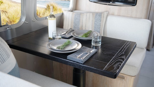 The new Airstream trailer features the standard amenities, including a dedicated kitchen, bathroom, sleeping and relaxing areas. But it levels up with hardware, soft goods, fixtures and touches inspired by Pottery Barn. The includes a unique solid oak wood dinette table, matte black pull-down kitchen faucet, wall sconces and custom storage solutions in the bedroom, plus Pottery Barn’s Belgian Flax Linen Bedding.