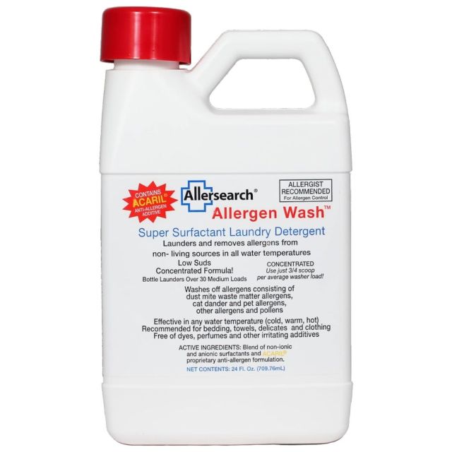 Clothes are notorious for hiding allergy-causing particles; afterall, they go everywhere we do. AllergenWash effectively cleans your laundry and washes away allergens like dust mits, cat and dog dander, and pollen from all fabrics without having to use water temperatures of 140 degrees or higher. Plus, a little goes a long way.