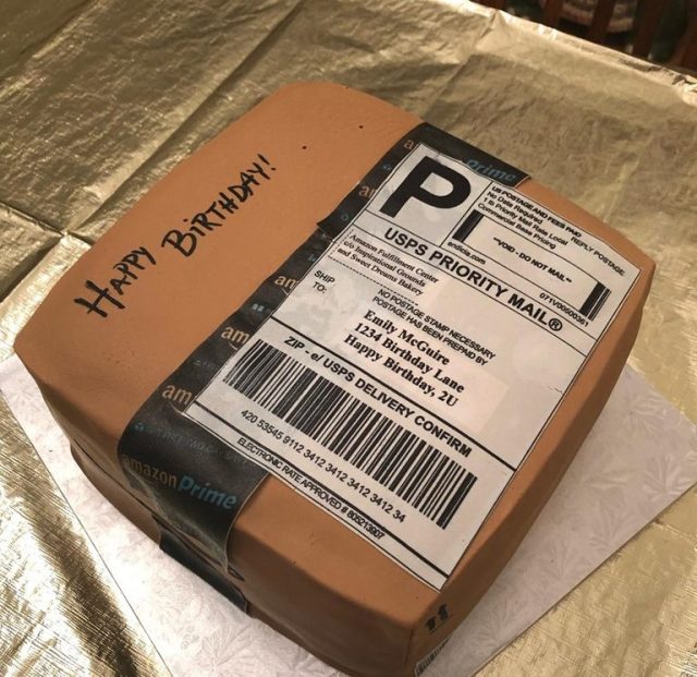 Not only did the cake’s shape take on the brown cardboard box form, but it also included a USPS label (adorably labeled to McGuire at 123 Birthday Lane) and the signature Amazon Prime packing tape.