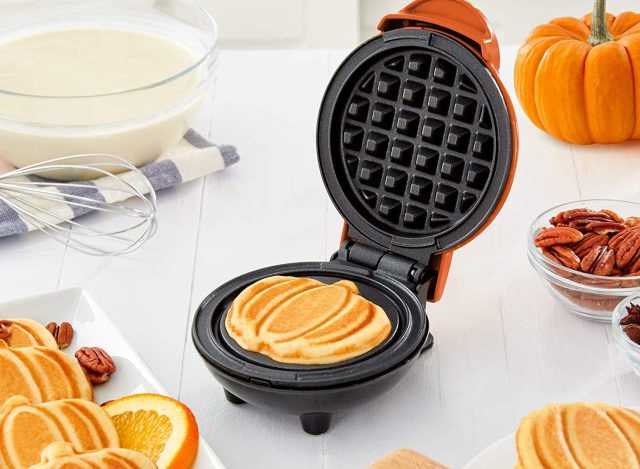 Not only can you make perfect little pumpkin-shaped waffles in this handy kitchen gadget, but you can also press paninis, hash browns or biscuit pizzas. If you’re still not sold, the pumpkin-shaped waffle maker also comes with a recipe book and online recipe access!