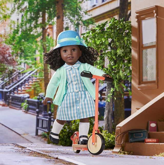 But what’s a girl without her accessories? Claudie also comes with a heart-shaped necklace, a paperback “Meet Claudie” book, cloche hat, journal, Baby Ruth candy bar, with plenty of extra sets available for purchase. Her collection includes a 1920s bakery that comes with more than 60 pieces; a doll-sized kick scooter; and plush dog, Dizzy Dot.