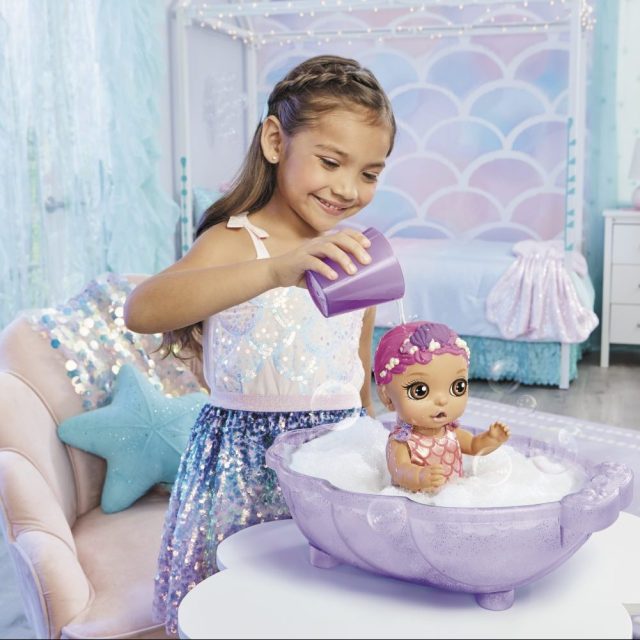 Splish splash into exciting new adventures with the BABY born Surprise Mermaid Surprise doll! With a little H2O, your little one can wipe away the doll’s sleepy eyelids to reveal her eye color, give her a bath in cool water to change her hair color, give her water from her sippy cup to discover a diaper surprise—a cute charm for the included charm bracelet—or even dip her starfish into water to reveal her shimmery swimsuit. Plus, this surprise-packed doll comes with her own sparkly seashell bathtub!