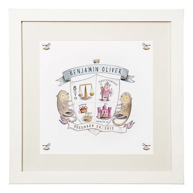 This colored-pencil drawing is the perfect keepsake to hang on the royal nursery wall. Each print which is inspired by a royal coat of arms, but with toys and animals, is customized with special details about your baby, including his or her weight, zodiac sign, parents' names, and the town and state of birth.