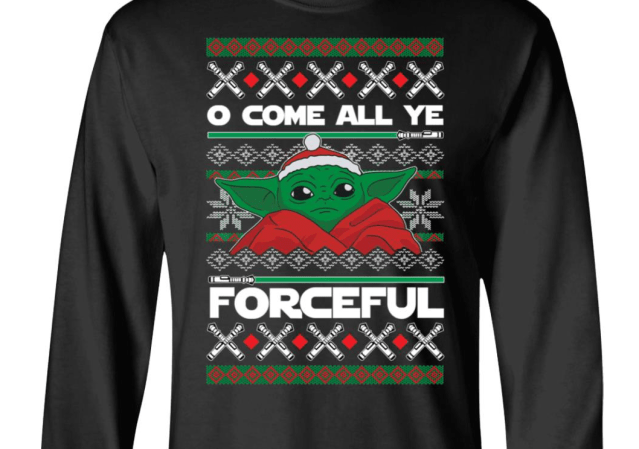 If you just can’t wait, this Baby Yoda Decal Vinyl Sticker is already available on Amazon for $6.99 or you can get in the holiday spirit and snag this O Come All Ye Forceful Baby Yoda Ugly Christmas Sweater Shirt ($27-$33).