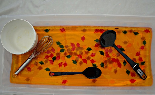 Slippery spaghetti is fascinating for babies. Add autumn-themed food coloring, a cauldron (a bucket or large cup), and plastic spoons, and watch your little witch or wizard conjure up fun with one of the easiest fall sensory activities around. Jamie at Hands On As We Grow suggests adding a dollop of oil to the noodles to up the slime factor.