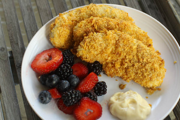 5. Toss the chicken tenders in the Honey Mustard/Mayonnaise mixture to coat and then dip them in the cornflakes/parmesan mixture until fully coated.