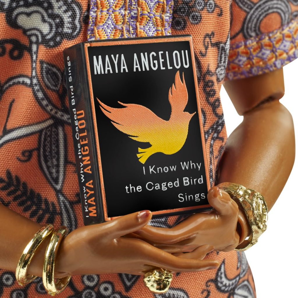 The Maya Angelou doll wears a head wrap and floor-length dress with floral print. She also holds a miniature replica of her prolific autobiography so girls can be inspired by her stories through play.