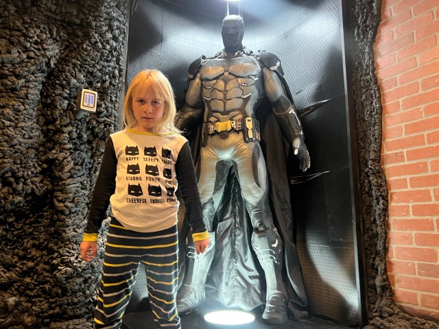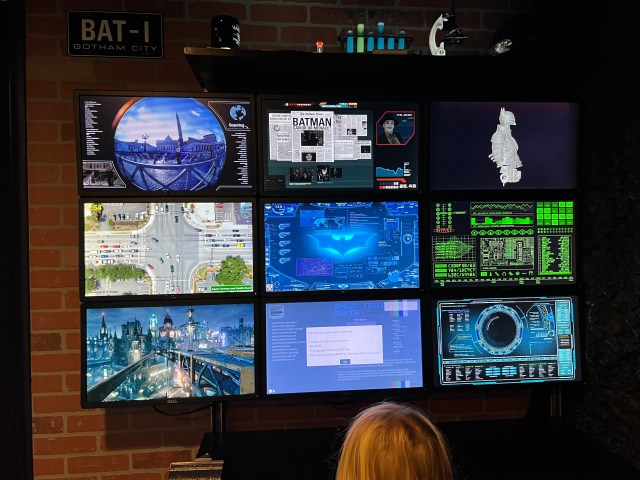 The cave is designed to look like you’re really underground (in reality, it’s a converted garage), with black rocky walls all around, and lighting that leaves you wondering what it all really looks like. In one corner, there’s a six-panel video screen where Batman presumably watches over Gotham City; in the other corner, an imposing life-size Batman watches over the room (I had to look twice to make sure he wasn’t actually a real person, because, you know, horror movies). Flick a switch and you can turn on some theme music, so your exploits overseeing Gotham can feel even more authentic.