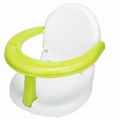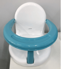 The recalled bath seats are made from white plastic and have green, gray, or blue restraint bars. Each seat also has four white suction cups on the bottom.
