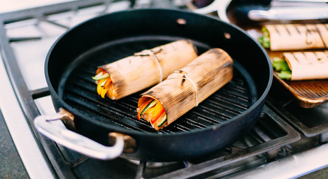 Cast-iron pans can hold up to the heat of the direct flame and work well for cooking veggies that might slip through a grill. Try cooking sliced onions, peppers and zucchini. You can also heat tortillas this way if you want to make fajitas.