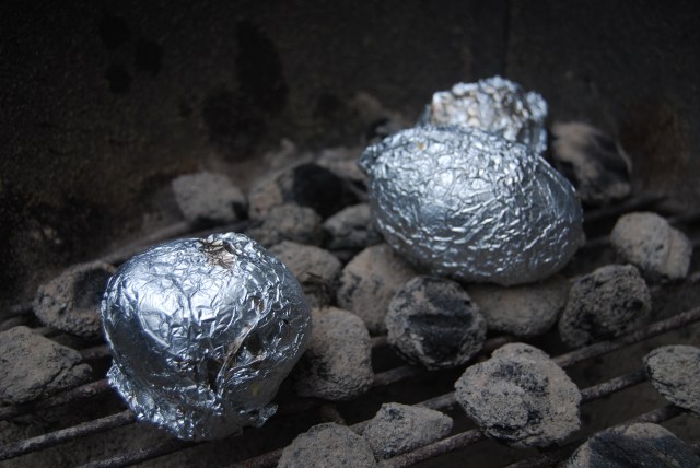 Cooking food right on the embers of a charcoal fire can save room on the grill, and potatoes cook nicely like this, wrapped in tin foil, shiny side on the inside. Try this technique with yams, potatoes, corn, eggplants and even apples. Wrapping potatoes like this will give a softer skin and should take about 45 minutes. Test for doneness by pressing on the wrapped potato with a gloved hand. Get tips from Get Out With The Kids.