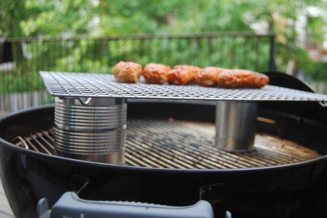 Plenty of gas grills come with warming racks, but you can rig up a DIY food warmer on a charcoal grill using a few empty tin cans and a cooling tray or grill on top. The extra distance from the flames makes this a good spot to warm the hot dog and burger buns or keep finished food warm. If the grill is covered, it can also be a spot to cook corn or other food that won't drip juices on the rack below.