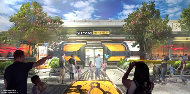 To the right of the image above, guests will be able to enjoy an outdoor seating area at Pym Test Kitchen, the on-campus eatery. Park goers will have a prime viewing area to watch for their fave characters at the nearby Avengers Headquarters.