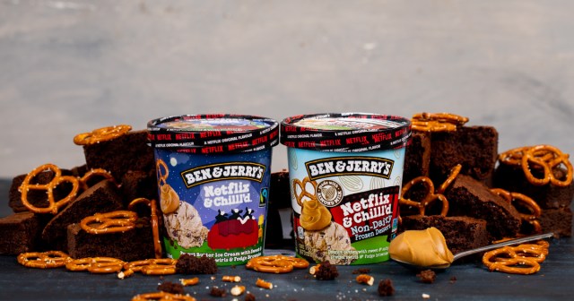 So what exactly does a Netflix-themed ice cream taste like? Ben & Jerry’s delish delight is a frosty blend of peanut butter ice cream, pretzel swirls and fudge brownies.