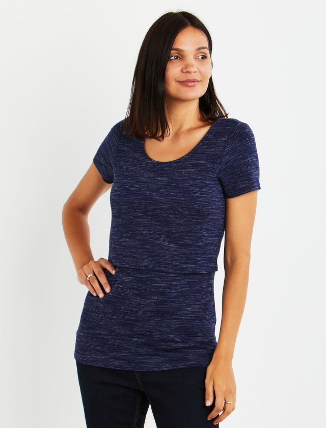 This tee has a split front layer that makes breastfeeding a cinch. The shirt is styled to emphasize your waist and is machine washable.