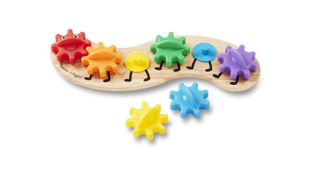 With six interchangeable gears in bright colors, toddlers can move them around the board and watch the caterpillar “move,” all while developing hand-eye coordination and fine motor skills.