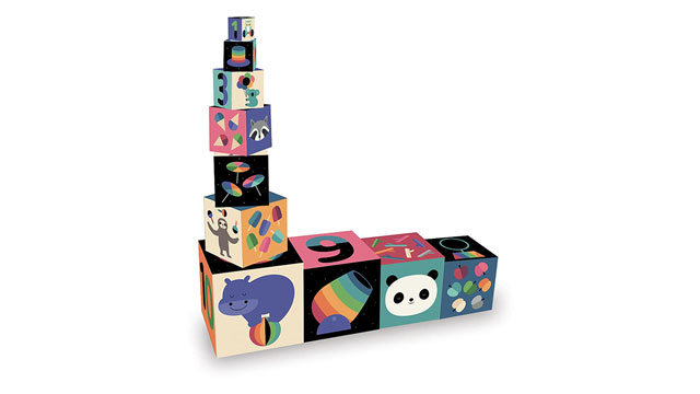 Each of these 10 cubes has an animal, food, and an object related to the number on the box. Stack them, fill them with toys, or tell a story with the illustrations.