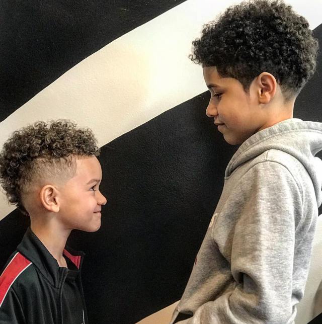 Tame those curly tresses with a neat fade. The kids will score cuteness points for matching back-to-school hairdos like this duo. Don't forget the curl treatment before styling!