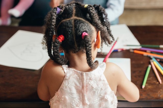 Keep natural hair protected, out of the way and totally adorable with multiple braids and colorful bands.