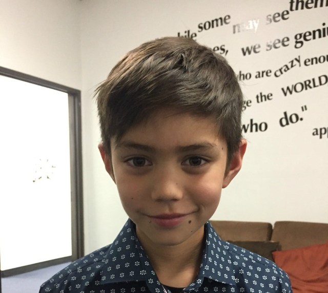 Not all boy haircuts have to be short. Side bangs and layers make this longer look manageable. A little bit of gel to keep it contained, and he's ready to go!