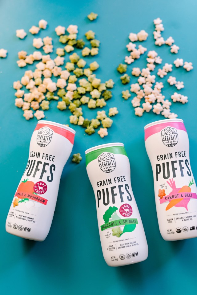 If your babe is a puff fanatic turn to the brand-new grain-free puffs from Serenity Kids. With zero grams of sugar and no fillers like rice and grains, Serenity Kids leads with cassava root and real veggies. Choose from flavors like Carrot & Beet with Olive Oil, Broccoli & Spinach with Bone Broth, Tomato & Mushroom with Bone Broth and Sweet Pepper & Basil with Olive Oil. The entire line is non-GMO and USDA Organic certified.