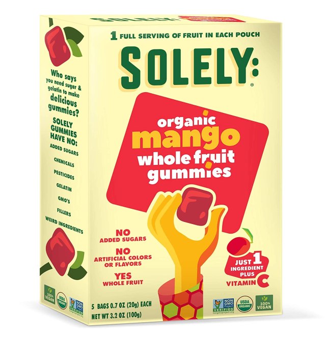 Solely's new Organic Whole Fruit Gummies contain only two or three ingredients, real whole fruit and a little Vitamin C. Every pouch offers 0.7 ounces of fruit, is only 60-70 calories and has no added sugar, preservatives, gelatins, colors, or gums. They're also USDA organic, Kosher, and Non-GMO verified. Choose from Organic Mango and Organic Mango & Orange flavors!