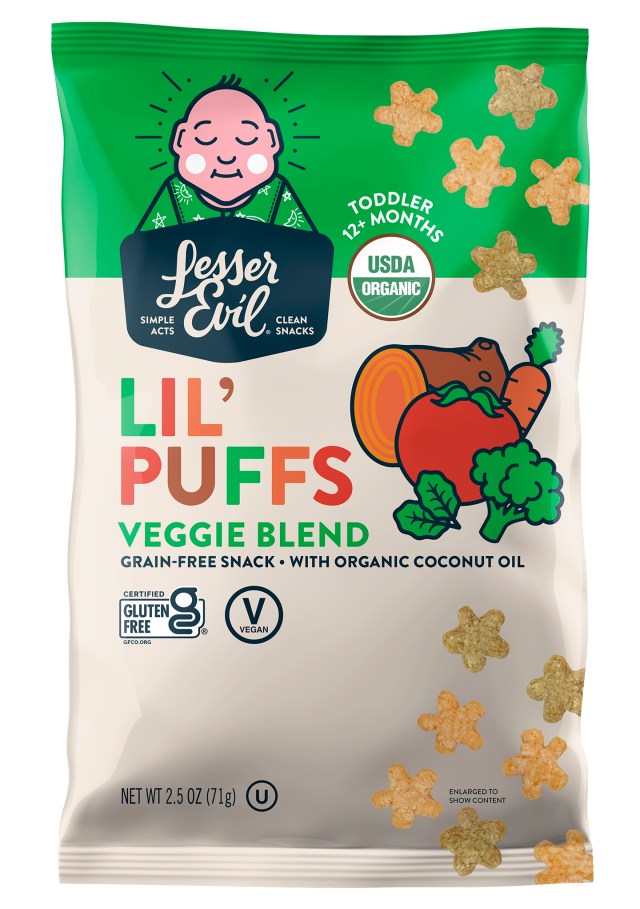 We'll just come out and say it: these new snacks from LesserEvil are so delicious you'll want to buy one bag for them, and one bag for you. The brand-new line includes flavors like Veggie Blend, Sweet Potato Apple, Non-Dairy Cheddar and Strawberry Beet. The puffs, which are in fun star-like shapes, use organic coconut oil and offer zero grams of sugar. They're certified USDA organic, vegan, non-GMO project verified, grain-free and gluten-free. The tasty snacks are best for toddlers 12 months and older.