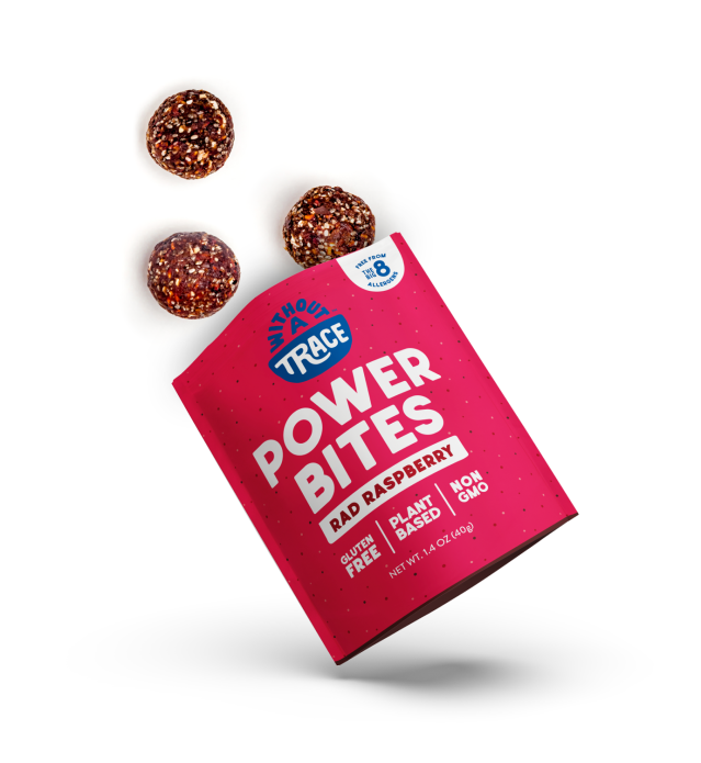 Gluten-free and plant based, Without a Trace's Power Bites are tasty as can be. The allergen-friendly bites are made with real ingredients and are free from chemicals, fillers, are non-GMO and the Big 8, plus sesame. Enjoy these fork-free morsels in Red Raspberry and Cinna-Monster.