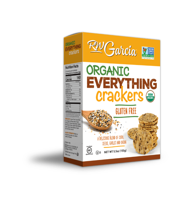 Get all the things you love about an Everything bagel in a thin, tasty cracker! RW Garcia's delicious snack is organic, verified non-GMO, gluten free, kosher and is made with corn, seeds, garlic and onion.