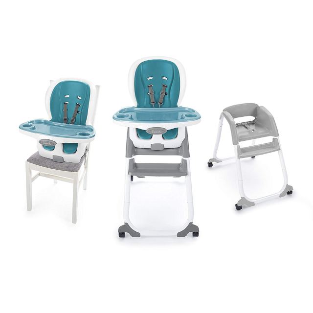 The Blossom easily converts from an infant high chair to a traditional high chair, infant booster seat, toddler booster seat and youth chair. It not only grows with your child, it can also accommodate two siblings using different stages of the chair at the same time. There are six height options and three recline positions, and sturdy wheels mean it moves easily around your home. Locking rear casters prevent it from moving when you don’t want it to. The tray is removable with one hand and features a dishwasher-safe insert for even more convenience.
