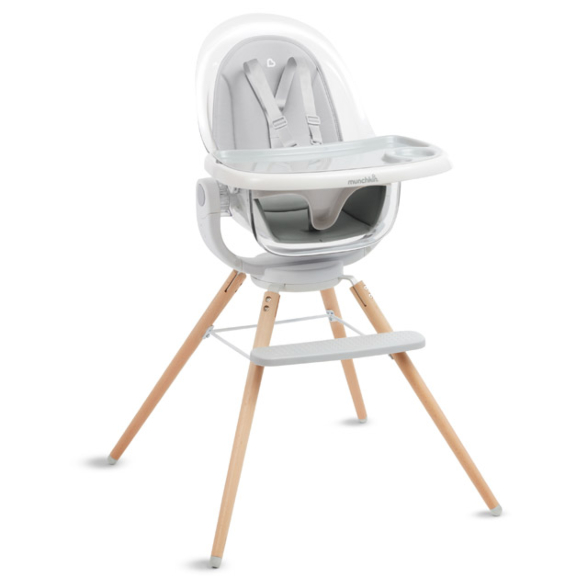 This eco-friendly, ultra-modern chair gives you lots of options. It converts from a baby seat to a toddler seat to an adult chair in seconds, and the restraint can be adjusted from a 5-point to a 3-point harness. You can also choose a color combo to suit your style or home: It comes in a mahogony and lighter wood frame, with a seat back and cushion in blueberry, cream white, olive, pearl black or raspberry. The included tray cover can be tossed in the dishwasher for easy clean-up.