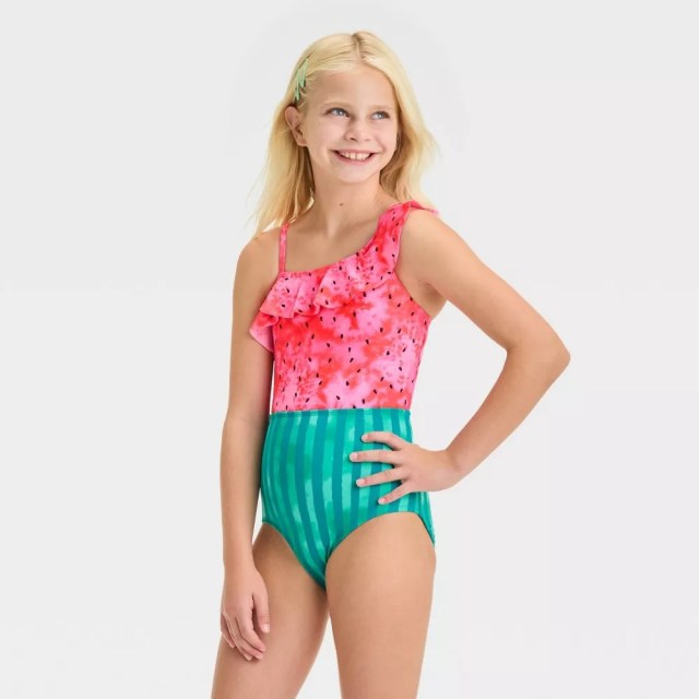 What's more summery than watermelon? This one-piece suit includes an adjustable one-shoulder design, so you get the perfect fit. Available in kids' sizes XS to XL Plus.