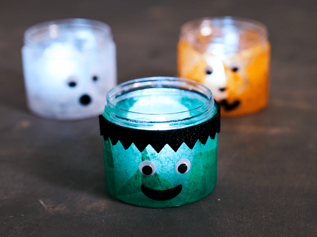 Create four Halloween luminaries with this kit that has all of your Halloween favorites like a ghost and spider.