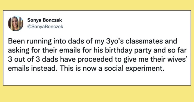 Sonya Bonczek was just trying to invite her child’s classmates to their birthday party. But when the mom of a 3-year-old attempted to ask the dads in class for their email addresses so she could send an invite, the responses were eye-opening.