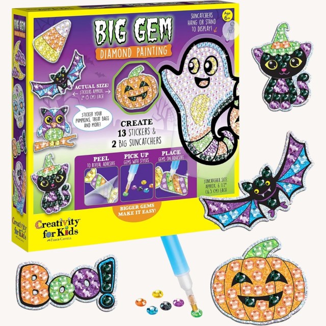 Over 1,000 tiny gems might sound like a nightmare, but trust us: kids love it. And the results? Adorable haunted stickers and suncatchers worth every sparkle.