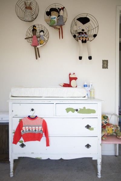 Turn your child's fuzzy friends into decorations by giving them wire-planter homes along the wall. Vary the size of the wire planters if you like, and secure them with nails or tack putty. For this and more visual aids on using thrifted goods for a European-inspired nursery, visit Bleubird Vintage.