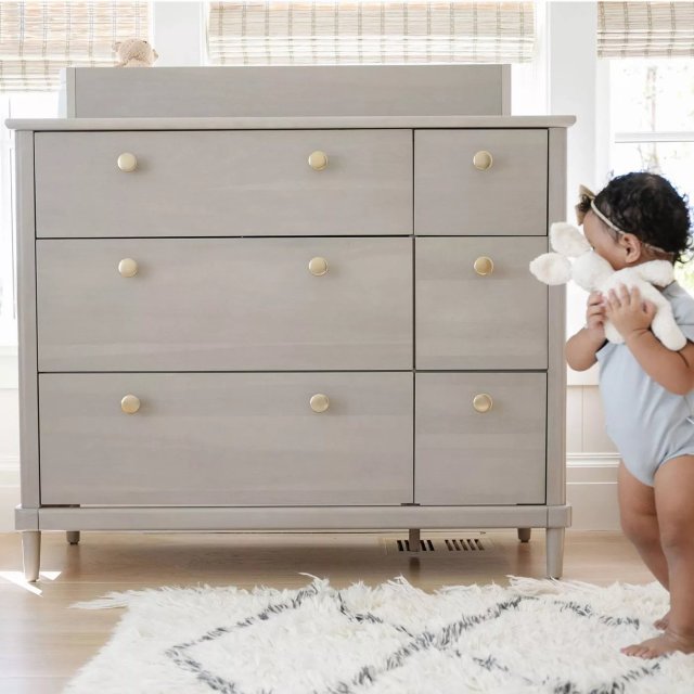 Storkcraft has been delivering dream nurseries and kid rooms for more than 75 years, which means they've gotten really good at innovating new, functional pieces that last. This Timeless 6 drawer dresser pulls double-duty as a changing table. Featuring three deeper drawers for maximum organizing and storage potential plus three streamlined drawers to store items requiring quicker access, the Timeless Dresser blends nursery style and function. Comes in white and gray.