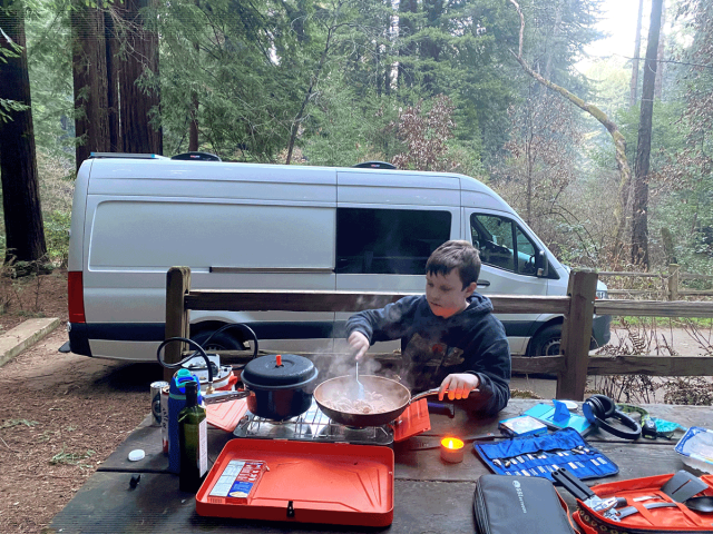 The main drag of the family road trip is arguably the constant dining out. The GoCamp vans save you the aggravation (and funds) that requires by bringing your kitchen with you. While all the rigs are set up slightly differently, our Sprinter van had a pump-powered sink where we could wash dishes and an indoor area if we needed to cook out of the elements. It also came with a folding table to set up a kitchen outdoors.