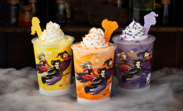 Available now through Halloween, the shakes each feature the distinctive personalities of the sisters. Sarah’s Chilling Churro Shake combines Churro Crunchies with cinnamon-sugar churro ice cream, topped with yellow sprinkles. Winnie’s Glorious Cake Batter Shake mixes up cake batter ice cream, topped with orange sprinkles. And Mary’s Divine Cookies & Cream Shake blends vanilla with cookie and cream pieces, topped with violet sprinkles.