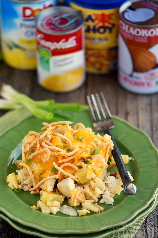 The flavors of the islands meld in this easy weeknight casserole that uses ingredients you probably already have in your pantry: pineapple, chicken, sliced almonds, water chestnuts, green onions and rice cooked in coconut milk.