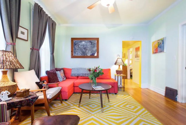 With a yellow carpet, red couch, and multi-hued curtains throughout, you’ll find many backdrops for snapping Instagram photos. You’ll be within walking distance to nightlife and urban exploring, as well as public transportation.
