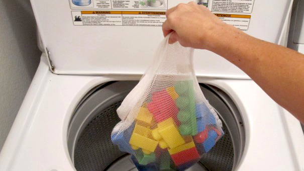 Whether covered in sticky residue from your own kid or if you’re giving a secondhand set a fresh start, plastic blocks clean right up when sent through the wash. Be sure to add items like towels or sheets to prevent banging during the cycle.