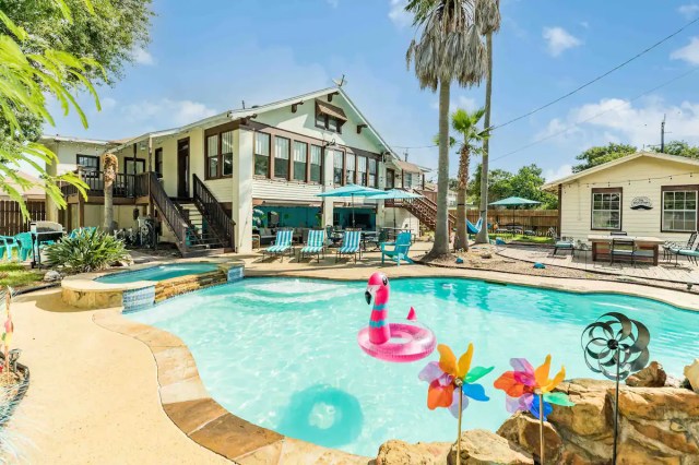 This has something for everyone. It's a historic 1923 home with a heated spa and pool, huge backyard, beach-themed interior, and only a 10 minute walk to the beach. 12 guests/3 bedrooms/7 beds/3 baths Galveston, TX—Coastal Castle—Book Here!