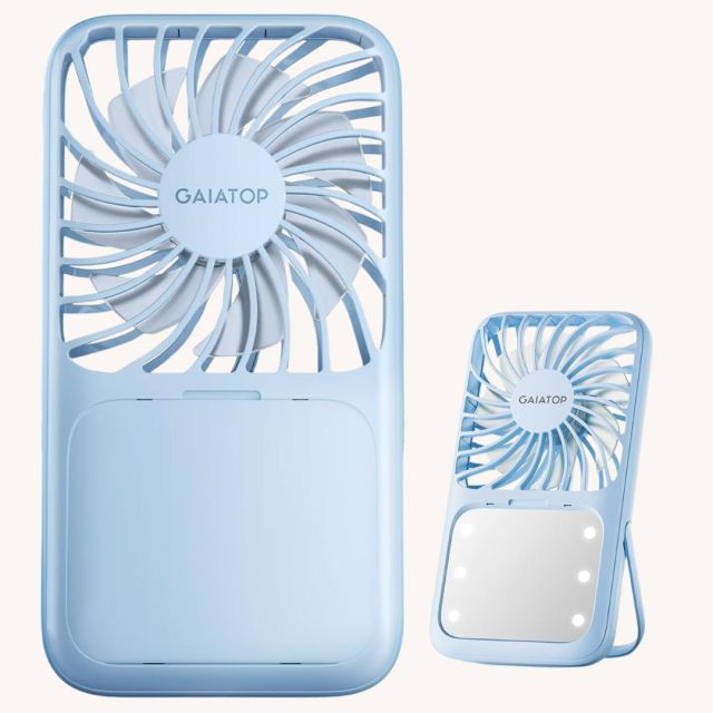 Whether you're carrying it or using the included stand to prop it up somewhere convenient, this little fan is a huge help. Available in 6 colors.