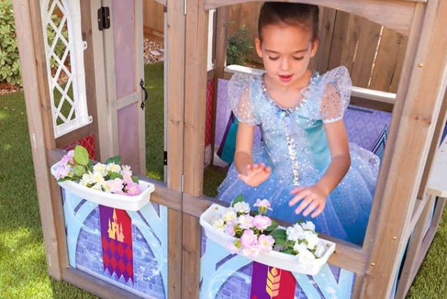 Use this cute castle-like playhouse for hours of indoor or outdoor play. The serving window is perfect for a “Frozen” lemonade stand and the chalkboard panels are ideal for hours of artsy adventures.