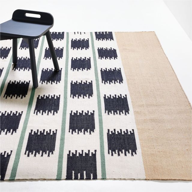 Add a pop of fun and functional color that easily holds up to kids with this geo rug.