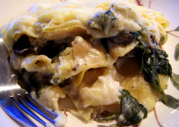 7. Place half the mushroom mixture over the noodles. Then add another cup of white sauce and 1/2 cup grated Parmesan cheese. Repeat this process until you are left with the top layer, which is noodles, the remaining white sauce and Parmesan cheese.