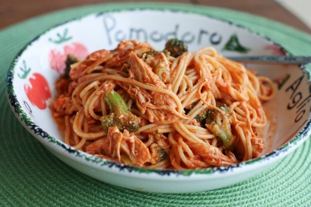 Ricotta cheese gives this kid-approved Crock Pot chicken recipe its extra creaminess. The chicken cooks up in your favorite spaghetti sauce with the pasta and broccoli added to the pot at the end of the cook time. Head to Aggie's Kitchen for the recipe.